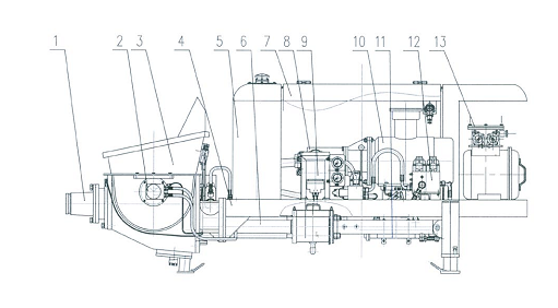 1.出料口 2.攪拌機(jī)構(gòu) 3.料斗 4.機(jī)架 5.液壓油箱 6.泵送系統(tǒng) 7.機(jī)罩總成 8.潤(rùn)滑系統(tǒng) 9.動(dòng)力系統(tǒng) 10.防暴電動(dòng)機(jī) 11.液壓系統(tǒng) 12.水冷卻部件 13.電器總成