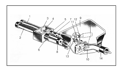 1)(2)主油缸  (3)水箱  (4)換向裝置  (5)(6)混凝土缸 (7)(8)混凝土活塞  (9)料斗 (10)分配閥 (11)擺臂  (12)(13)擺動(dòng)油缸  (14)出料口